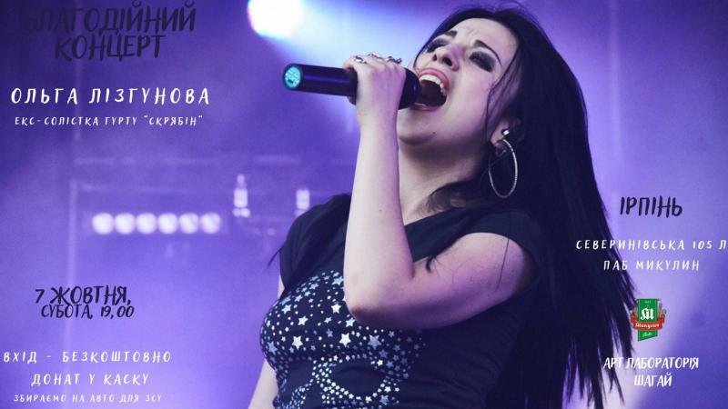 В Ірпені відбудеться благодійний музичний вечір концерт, на якому виступатиме неймовірна екс- солістка гурту Скрябін Ольга Лізнунова Lizgunova. Будемо збирати кошти для 71 окрема єгерська бригада Десантно-штурмових військ ЗС України на доставку автомобіля з Литви.