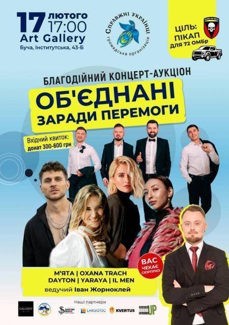В Бучі відбудеться великий благодійний концерт "Об'єднані заради перемоги". На благодійному заході виступатимуть: