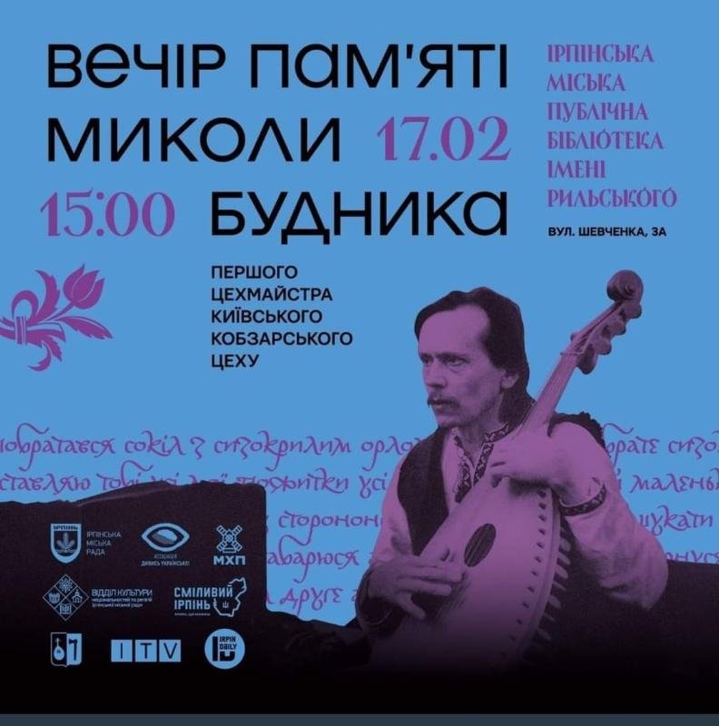 17 лютого о 15.00 в Ірпінській бібліотеці імені Максима Рильського відбудеться вечір пам’яті кобзаря, першого цехмайстра Київського кобзарського цеху Миколи Будника.