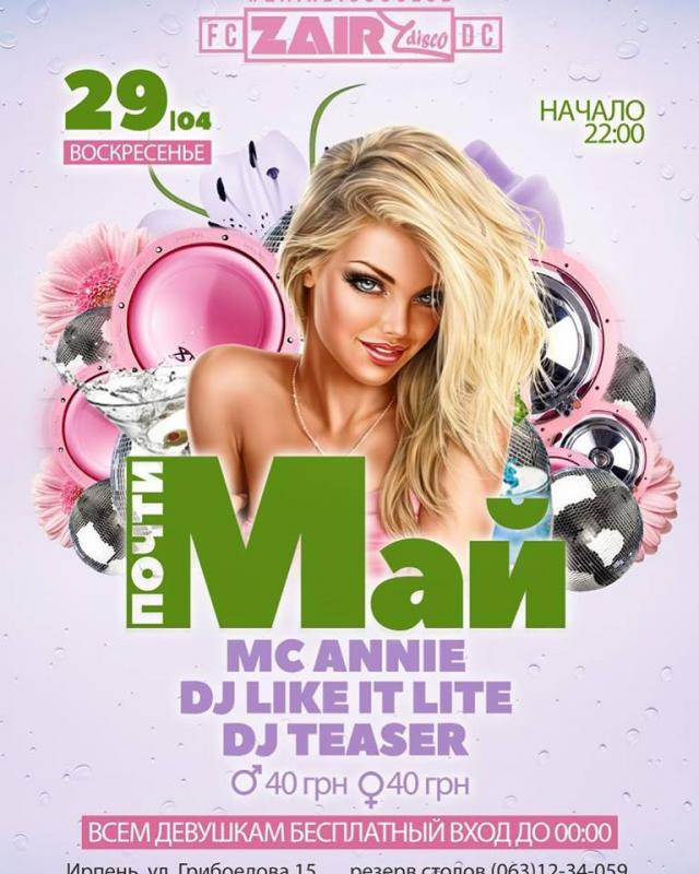В неділю в Zair Disco Club ніч наших улюблених резидентів. За пультом: MC Annie, DJ Like it lite та DJ Teaser.