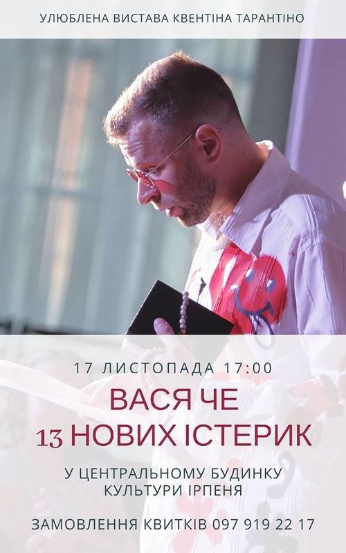 17 листопада в Центральному будинку культури ірпінський актор та письменник Василь Чернявський представить свою виставу "13 нових істерик". Вже наступного дня ту ж виставу Вася Че представить і в Києві.