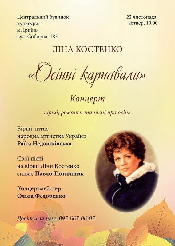 В четвер, 22 листопада в Ірпені пройде концерт присвячений творчості Ліни Костенко. В програмі: виконання віршів відомої поетеси та пісень на її твори. Запрошуються усі охочі!