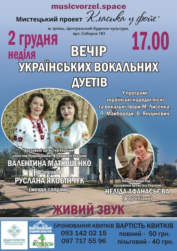 Після сольних виступів артистів національної філармонії України організатори "Уваровського дому" влаштовують вечір українських вокальних дуетів. У програмі українські народні пісні та вокальні твори М. Лисенка, П. Майбороди, О. Янушкевича.
