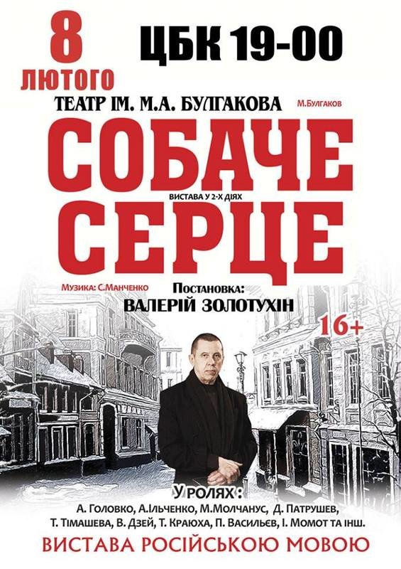 8 лютого 2019 року о 19.00 відбудеться вистава за романом Михайла Булгакова “Собаче серце”. Важкі часи — суворі звичаї. Посеред революційного терору, розбрату та голоду професор Преображенський наважується на сміливий експеримент, який призводить до ще більш несподіваних результатів: з’являється зовсім нова людина, не заплямована тягарем минулого. Класична постановка вистави «Собаче серце» вражає своєю актуальністю і в сьогоднішній час. Загадкова Булгаковская містика, сучасне бачення сюжету гармонійно вписалися в концепцію вистави.