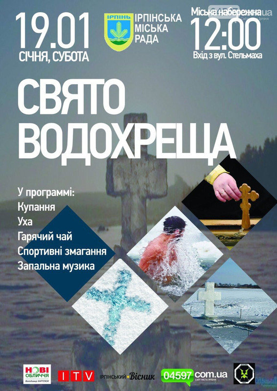 Вже традиційно в Ірпені 19 січня відзначають Хрещення Господнє купанням в ополонці. Цього року ірпінчани та гості міста можуть завітати на святкування Водохреща та скупатися в ополонці на оновленій Ірпінській набережній, де на всіх чекатиме уха, гарячий чай, спортивні гуляння та запальна музика.