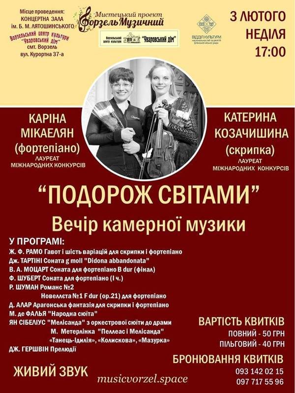 У неділю Ворзельський центр культури "Уваровський дім" запрошує всіх у дивовижну подорож світами камерної музики. Виконавці - Каріна Мікаелян (фортепіано) та Катерина Козачишина(скрипка). До зустрічі на концерті!