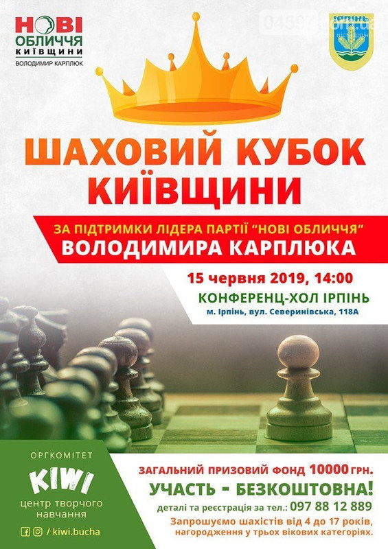15 червня цього року за підтримки команди «Нові обличчя» в Ірпені відбудеться "Шаховий кубок Київщини". Голова Інвестиційної ради Ірпеня запросив усіх бажаючих до участі.