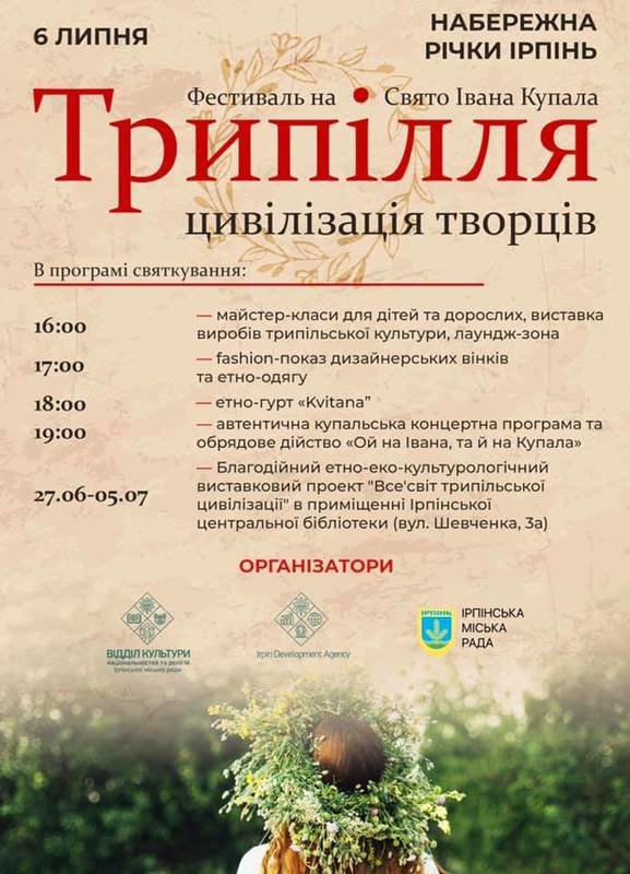 Ірпінчан запрошують зануритися у таємничу культуру Трипілля та містичних купальських обрядів, отримати неймовірне задоволення від різноманітних заходів Фестивалю “Трипілля: цивілізація творців” на свято Івана Купала. Програма фестивалю.