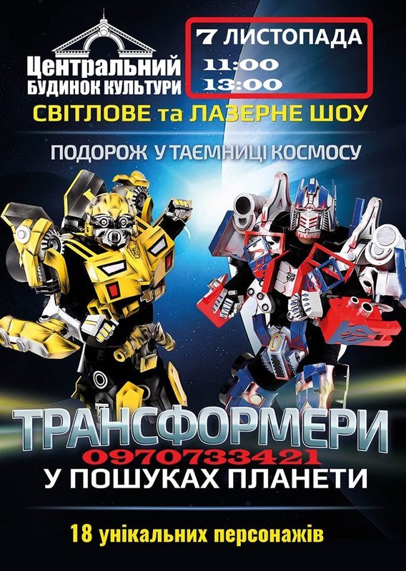Запрошуємо усіх до Центрального будинку культури Ірпеня на дитяче світлове та лазерне шоу "Трансформери. У пошука планети". Деталі: 0970733421