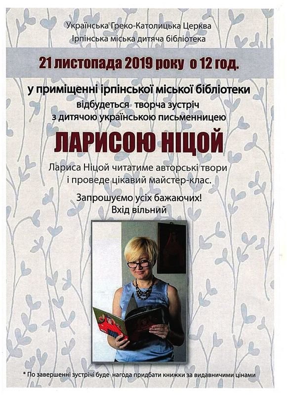 У приміщенні Ірпінської міської бібліотеки відбудеться творча зустріч з дитячою українською письменницею Ларисою Ніцой. Вона читатиме авторськф твори і проведе цікавий майстер-клас.