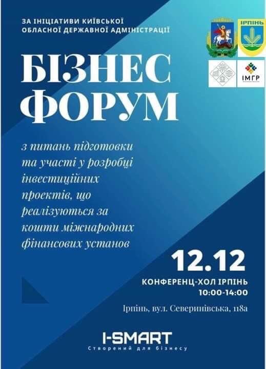 Не пропусти шанс відвідати Бізнес-форум в місті Ірпінь з питань участі в розробці інвестиційних проектів та можливостей грантових програм для бізнесу.?