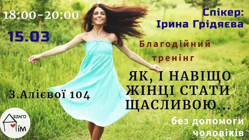 15 березня у Благодім відбудеться благодійний захід - лекція "Як і навіщо Жінці стати щасливою без допомоги чоловіків". Ірина Грідяєва, психолог з 15 річним досвідом ділитиметься таємницями: