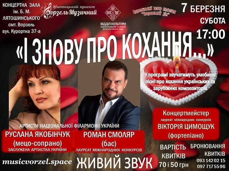 Виконавці: заслужена артистка України РУСЛАНА ЯКОБІНЧУК (мецо-сопрано), лауреат міжнародних конкурсів РОМАН СМОЛЯР (бас), концертмейстер - лауреат міжнародних конкурсів ВІКТОРІЯ ЦИМОЩУК (фортепіано)